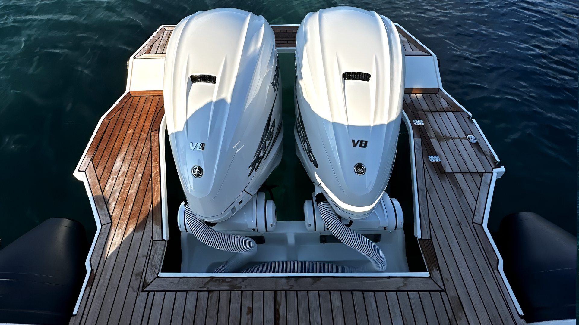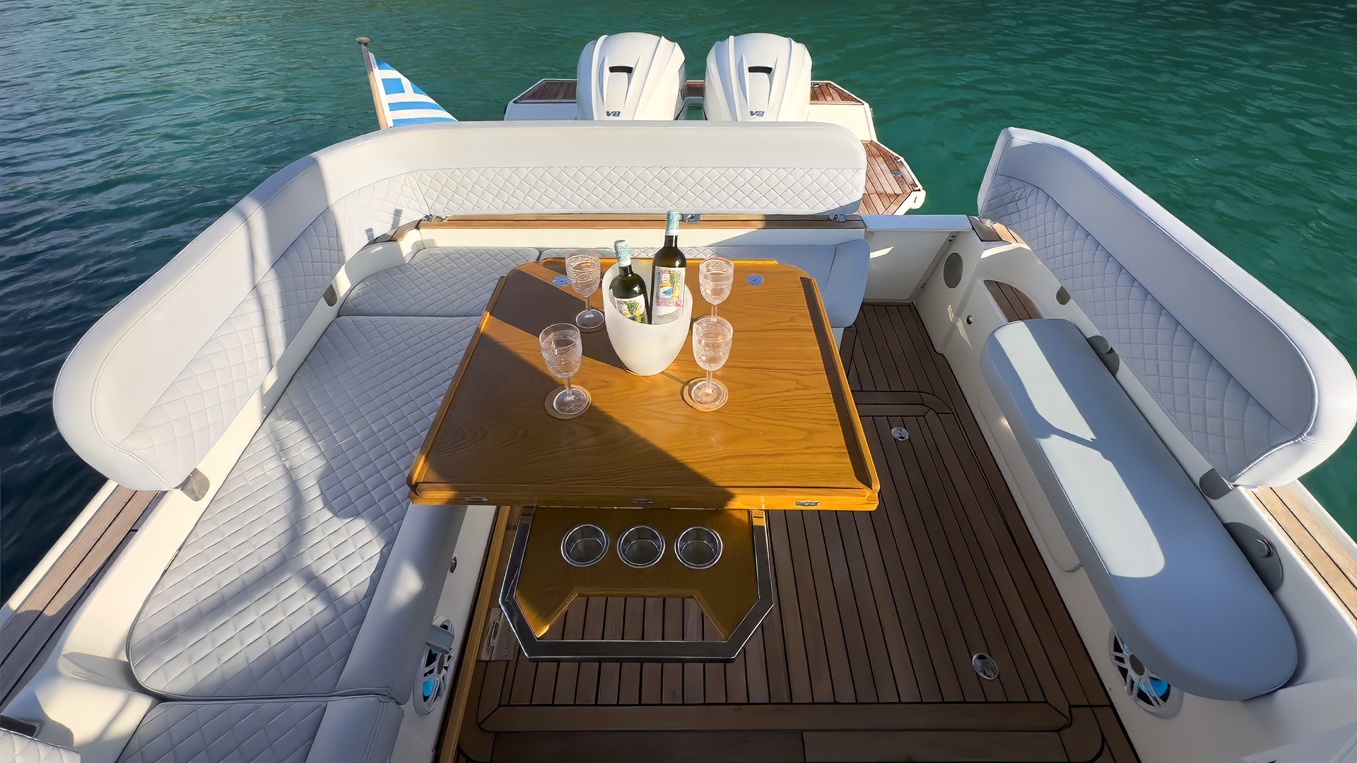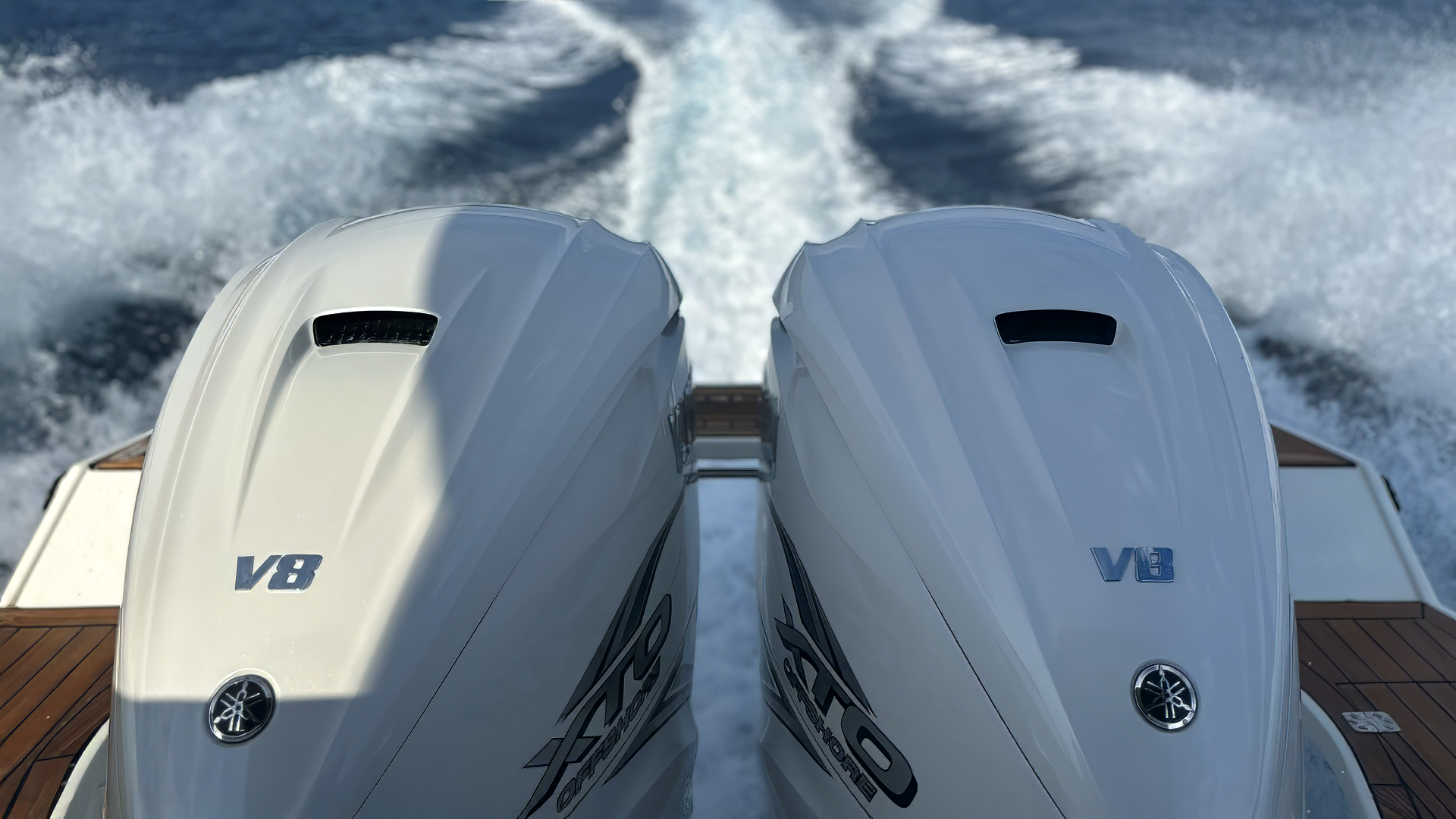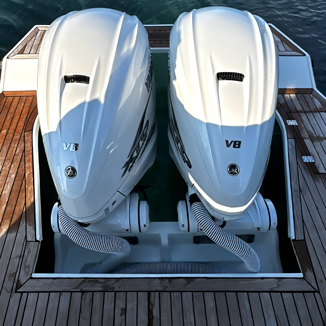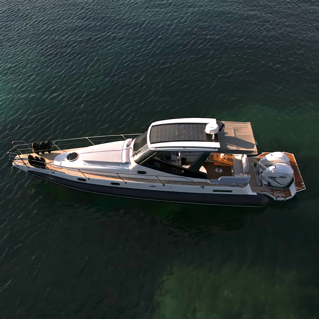 The vessel offers impressive performance thanks to two Yamaha engines of 425 hp each. Its service speed reaches 32 knots. The maximum speed is 57 knots, providing an exciting and dynamic cruising experience.