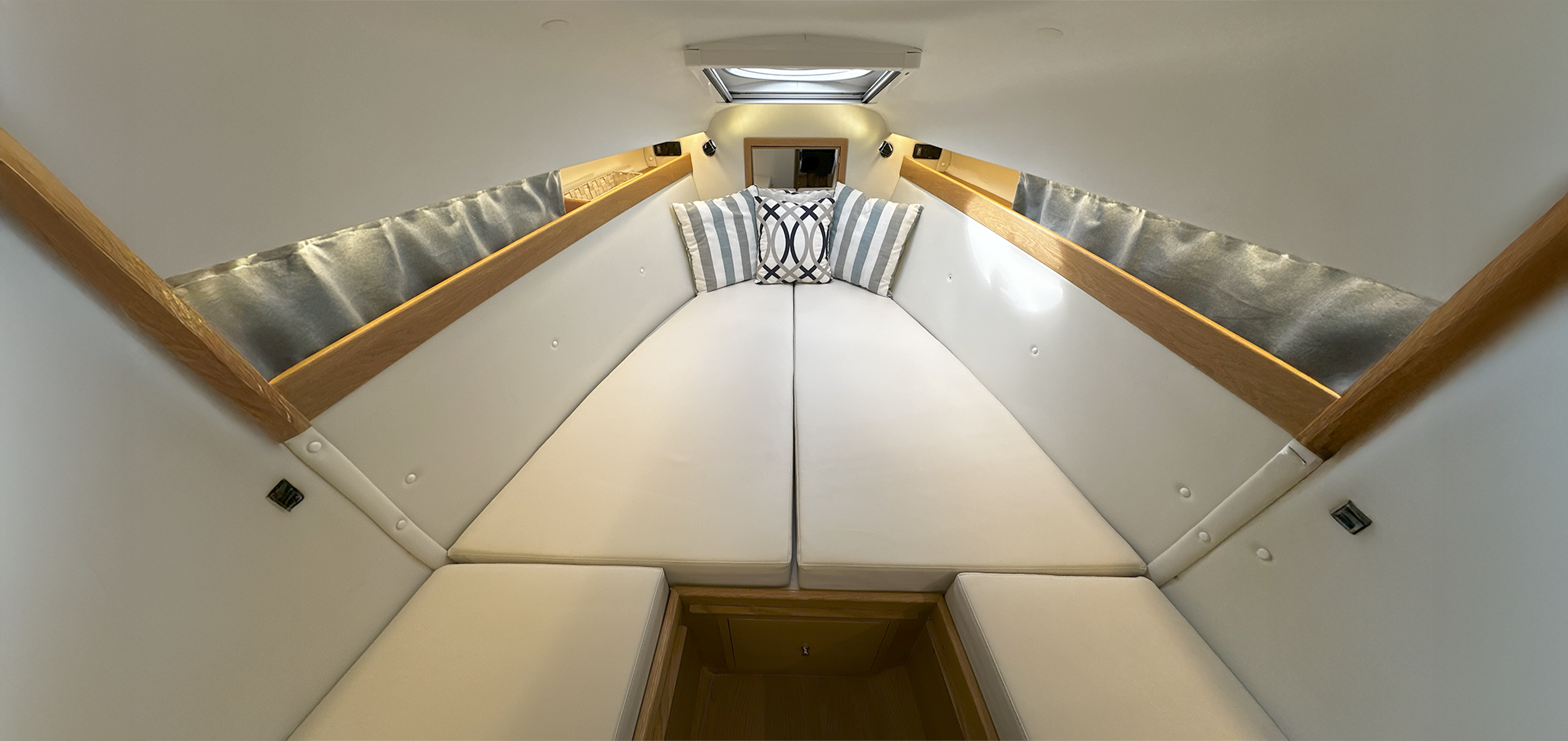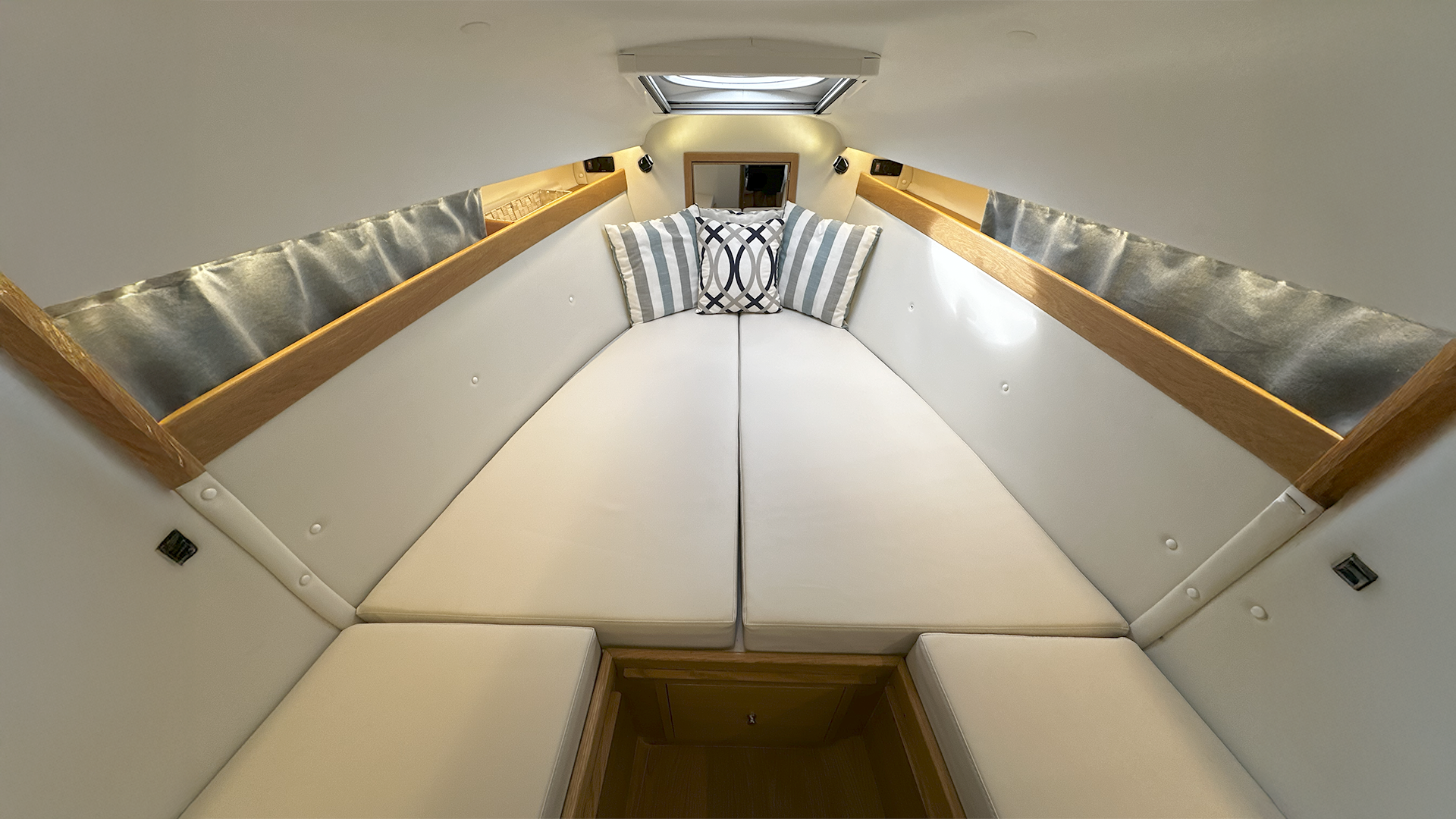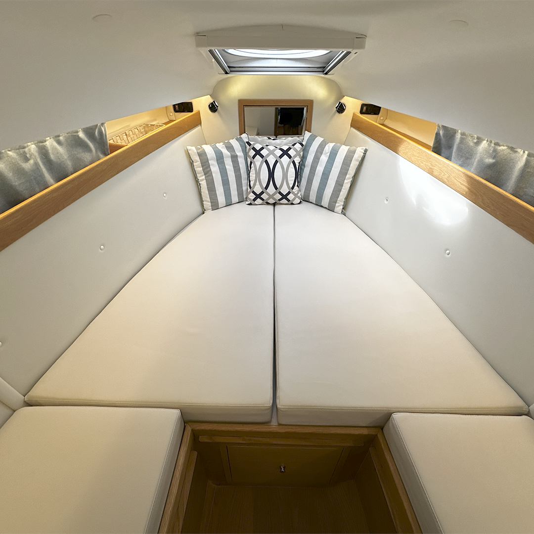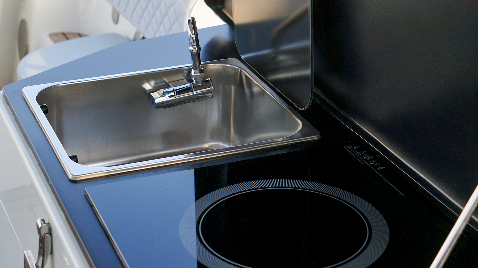 The fully equipped kitchen includes an induction hob and sink, allowing you to prepare meals in comfort. The 32” outdoor TV provides additional entertainment, while the two-person bow lounger adds a touch of luxury to the vessel.