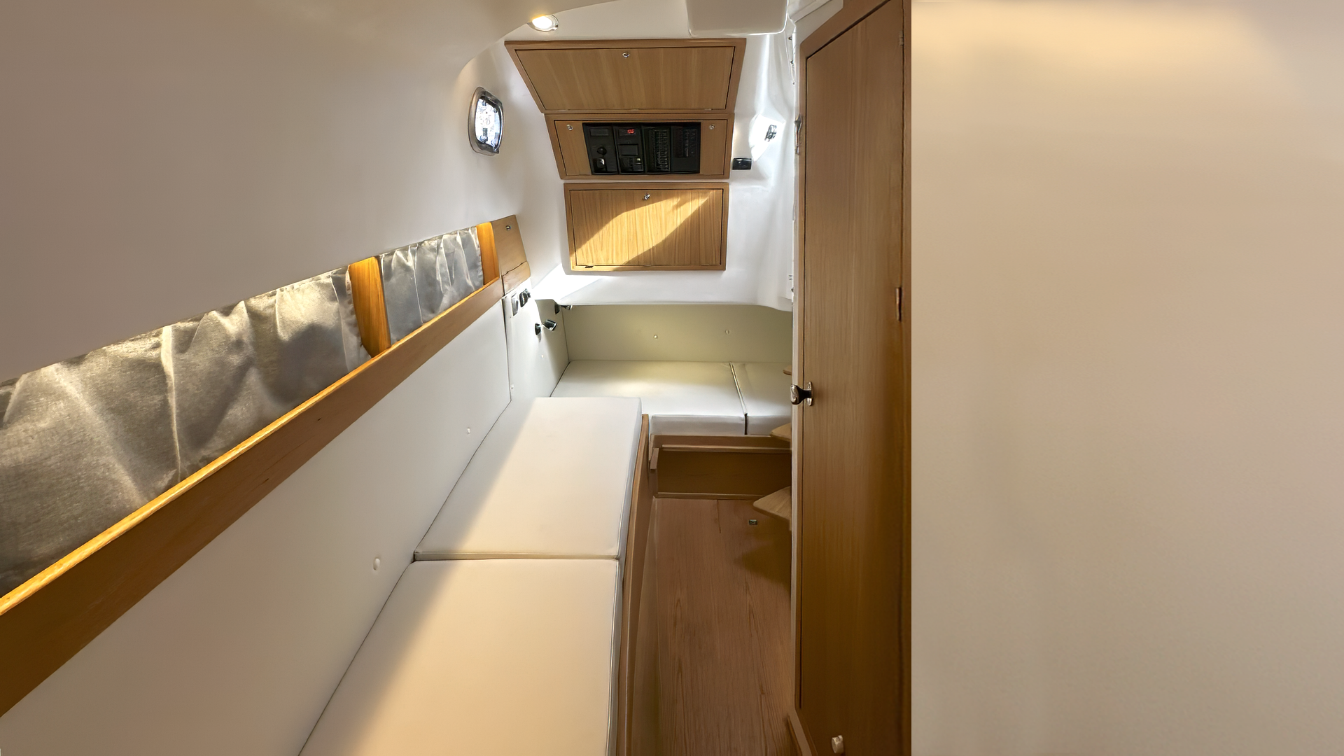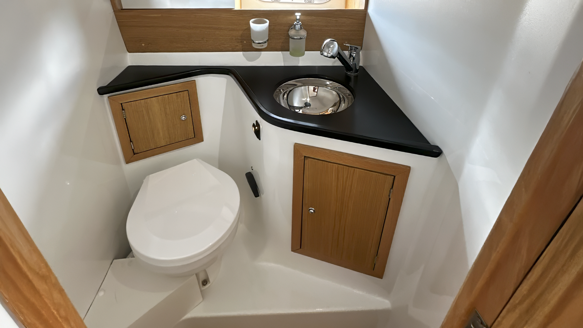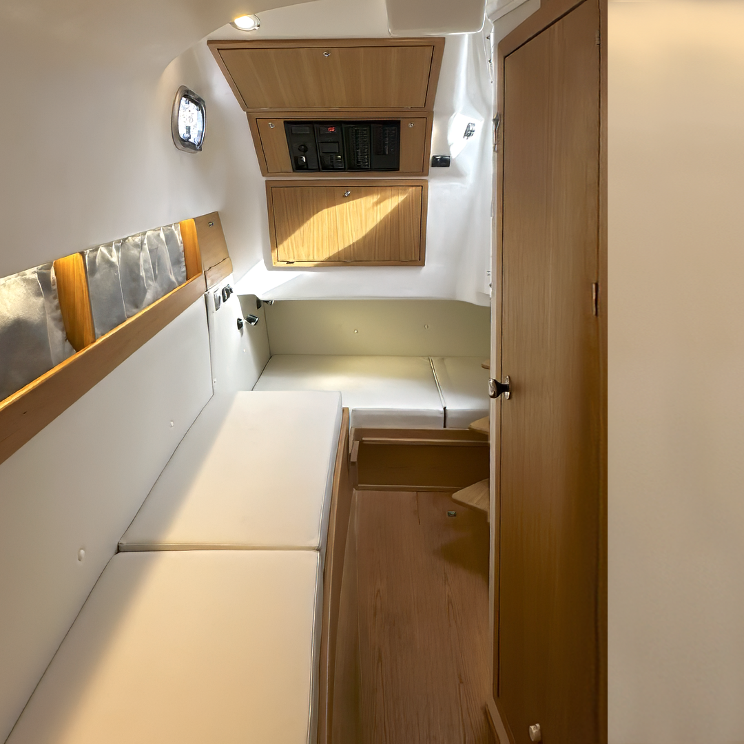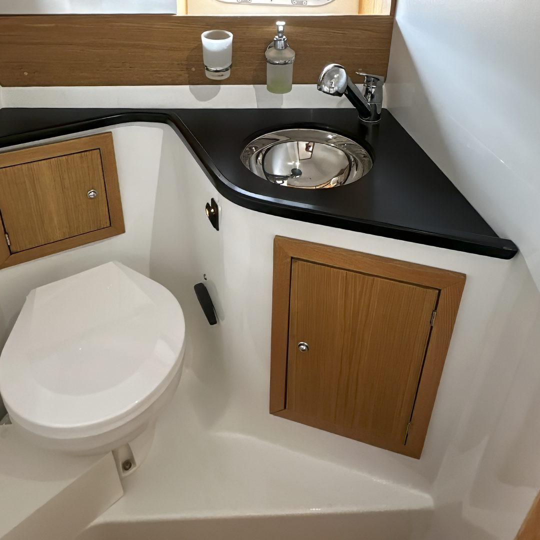 The interior of the vessel combines functionality and luxury. It includes a spacious super double bed in the bow and a comfortable single bed in the stern. The fully equipped bathroom has a toilet, sink, and shower with hot water, ensuring comfort and privacy. In addition, the exterior shower adds even more convenience and refreshment after a dip in the sea.